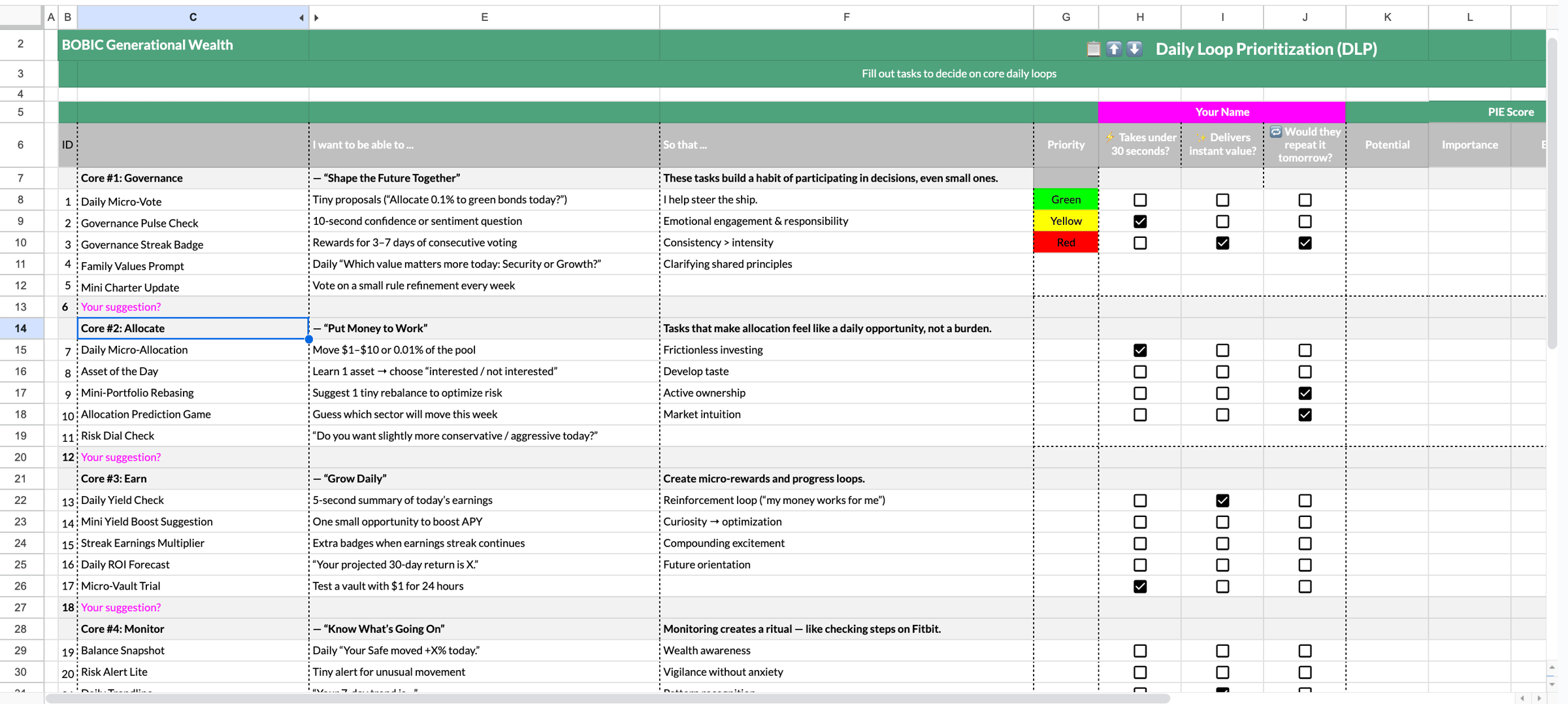 I listed tiny daily tasks for the 7 functions of wealth management in BOBIC to build a strong engagement loop. Help me expand the list and rate the existing ones — you can copy the Google Sheet template for your own product too.. Google Sheet here →