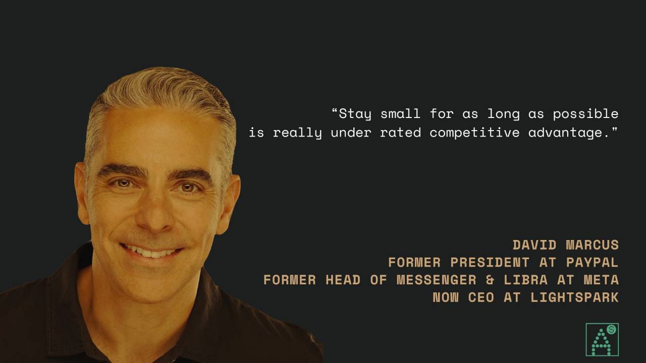 “Stay small for as long as possible is really a massively under rated competitive advantage." - David Marcus, ​former PayPal President, VP Messaging & Libra at Meta, now Co-Founder & CEO of Lightspark